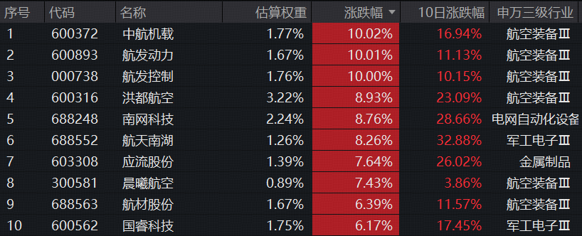 成份股方面,50只成份股中30只收涨。中航机载、航发动力、航发控制三股涨停封板,洪都航空、南网科技、航天南湖均大涨超8%,应流股份、晨曦航空涨超7%。