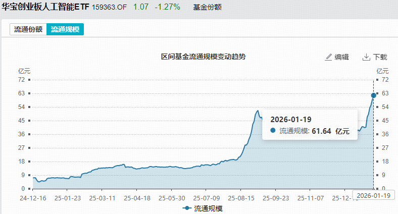 资金暴力涌入,创业板人工智能ETF华宝(159363)规模再创新高!截至1月19日,最新规模达61.64亿元再创新高,近6个月日均成交额近8亿元,规模、成交额在跟踪创业板人工智能指数的8只ETF中高居第一!