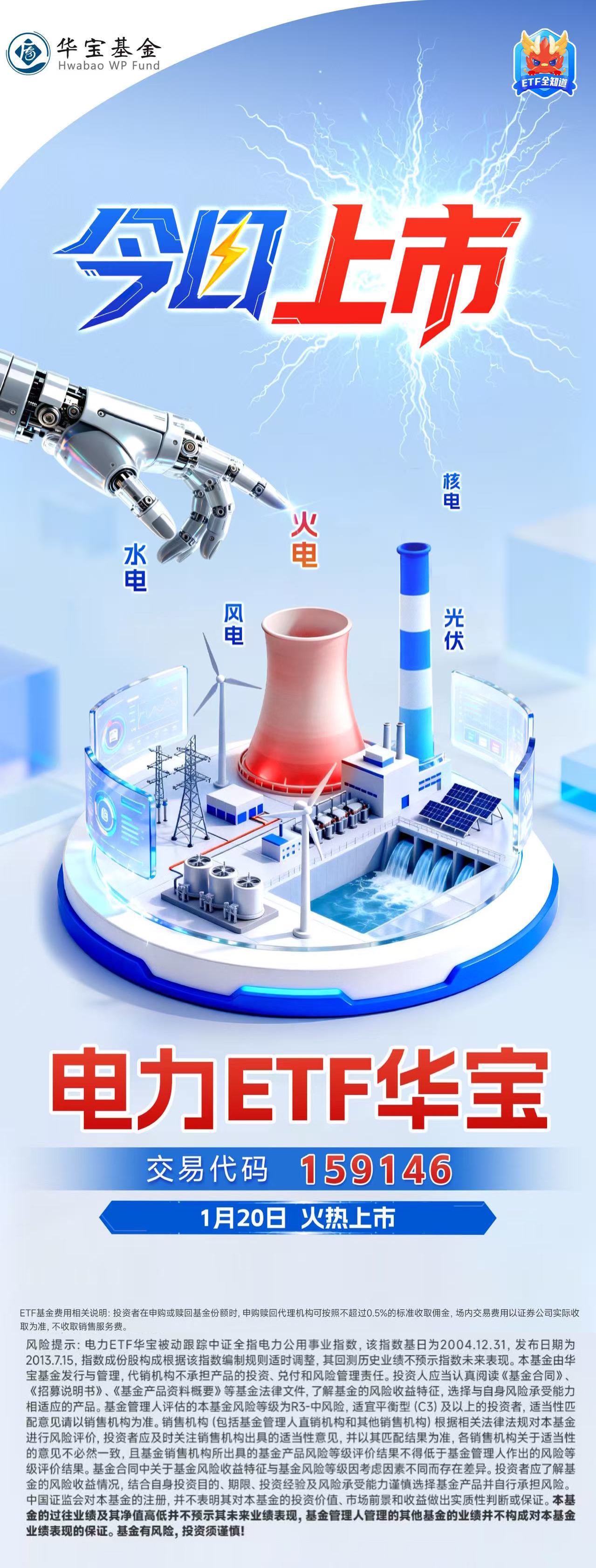 电力ETF华宝(159146)于2026年1月12日正式成立,并迅捷跟进,于今日(2026年1月20日)正式上市交易。该ETF的指向十分明确——把握AI相关能源机遇,为AI发“电”!据了解,电力ETF华宝(159146)跟踪中证全指电力公用事业指数(H30199.CSI),通过成份股“火、水、风、核、光”的多态电力配置,助力投资者在AI大时代战略性地实现“全电布局,攻守兼备”。