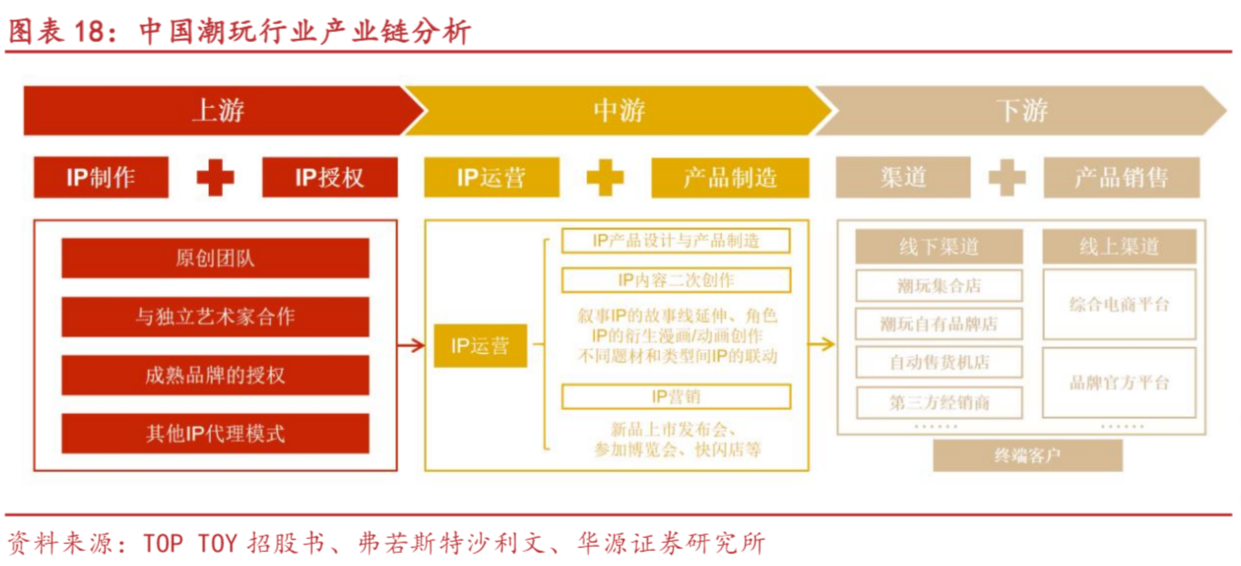 潮玩经济从功能性向情感性消费转型,2025-2030年国内规模CAGR预计为21%。根据国家统计局,全国规模以上文化企业的营业收入从2019年的8.7万亿元增至2024年的14.15万亿元,产业基本盘稳健。文创产品消费主要由消费者兴趣驱动,而情绪和文化价值、设计感以及纪念意义是最能促进消费者购买的爽点。根据TOP TOY招股书和弗若斯特沙利文,潮玩可分为手办、3D拼装模型、搪胶毛绒等。中国潮玩行业呈现快速增长趋势,零售额由2019年的207亿元跃升至2024年的587亿元,实现23.2%的复合增长率。这一增长主要受日益增长的情绪消费所推动,潮玩日益成为个人身份认同、怀旧情感与文化归属的表达载体。