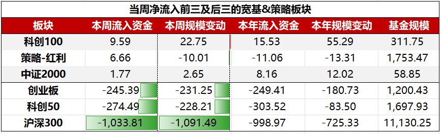 具体到细分板块,宽基&策略板块ETF中,净流入前三大板块依次为:科创100、策略-红利、中证2000;净流出前三大板块依次为:沪深300、科创50、创业板。