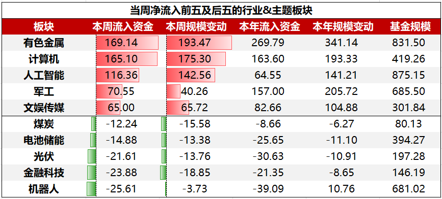 行业&主题板块ETF中,净流入前五大板块依次为:有色金属、计算机、人工智能、军工、文娱传媒;净流出前五大板块依次为:机器人、金融科技、光伏、电池储能、煤炭。