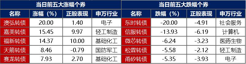 【转债市场主要指数集体上涨】 1月19日,转债市场延续上行,中证转债、深证转债、上证转债分别收涨0.45%、0.31%、0.65%。转债市场成交额869.68亿元,较前一交易日缩量165.12亿元。转债市场个券多数上涨,388支转债中,267支收涨,104支下跌,17支持平。当日上涨个券中,澳弘转债继续涨停20%,领涨市场,嘉美转债涨超15%;下跌个券中,东时转债跌停20%,信服转债跌逾13%。