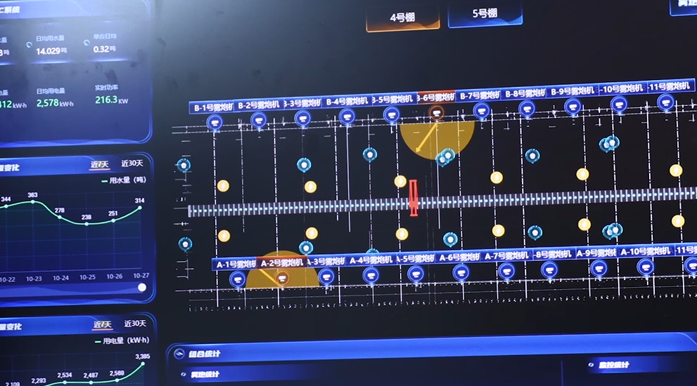 “过去靠人工巡检,仓库太大难免会忽略,有时粉尘起来了才手动开雾炮,整个大棚都得喷一遍,水和电用得心疼,还不一定能压住关键区域的粉尘。”湖南涟钢建设有限公司、广钢集团港务中心4、5号矿场超低排放棚化工程总工程师罗钟华坦言,当取料设备同时作业时,还无法快速启动多台雾炮,难以达到超低排放标准。