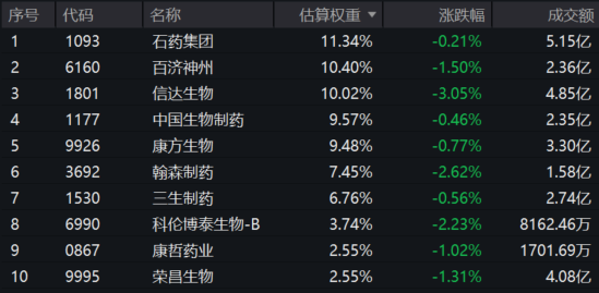 港股通创新药ETF(159570)标的指数权重股多数飘绿:信达生物跌超3%,翰森制药、科伦博泰生物-B跌超2%,百济神州、康哲药业、荣昌生物跌超1%,石药集团、中国生物制药、康方生物、三生制药微跌。