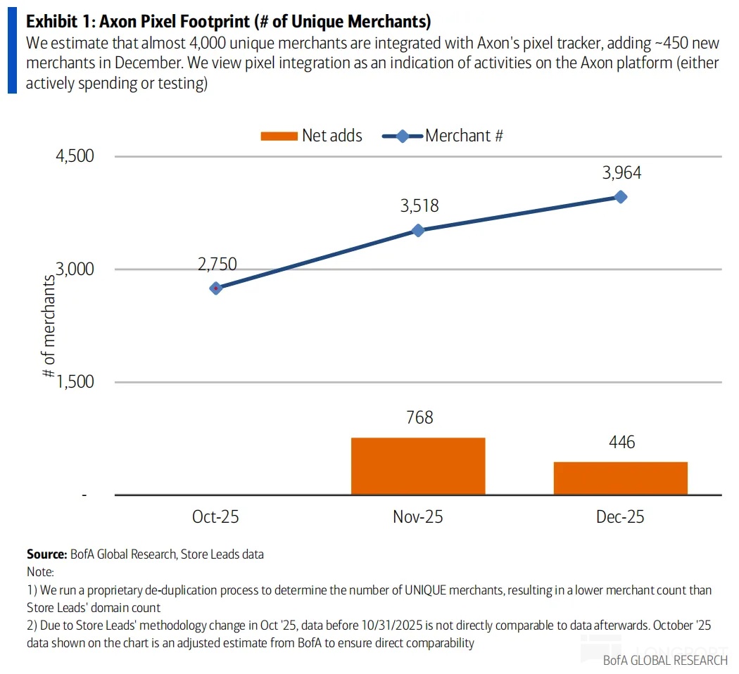 目前市场只能通过跟踪 AXON Pixel 安装数量来查看商家对 Applovin 的买量趋势变化。根据美银的追踪数据,12 月 Pixel 安装量净增 450 个用户,隐含已安装 AXON Pixel 商户达到 4000 家,稍高于其此前预期,但净增量环比下降。净增的 450 家广告主 73% 来自 Shopify,因此平均 GMV 也会相对偏小一些。