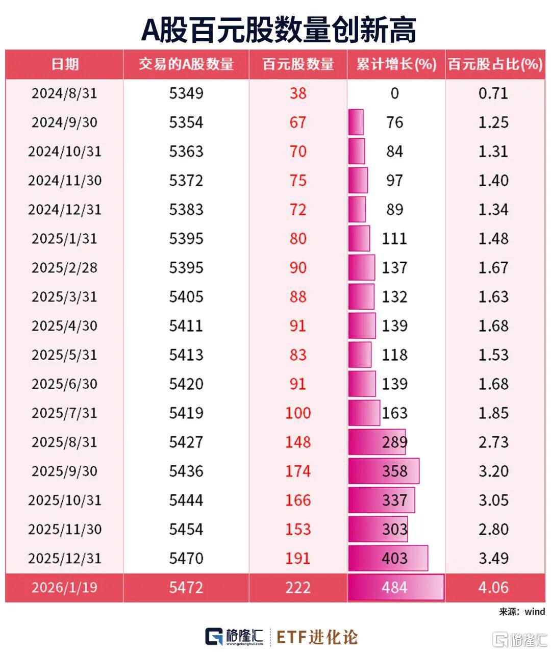 经历探底后,百元股数量一路飙升。2025年12月,百元股数量突破190只;进入2026年,百元股数量再次突破,目前已达222只。