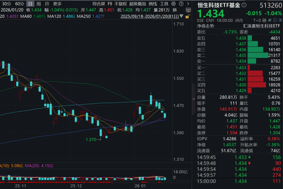 今日(1.20),港股科技再度回调,100%纯度的港股通科技30ETF(520980)收跌1.65%,全天成交额超3.3亿元!收盘溢价率达0.28%,或反映资金持续关注!