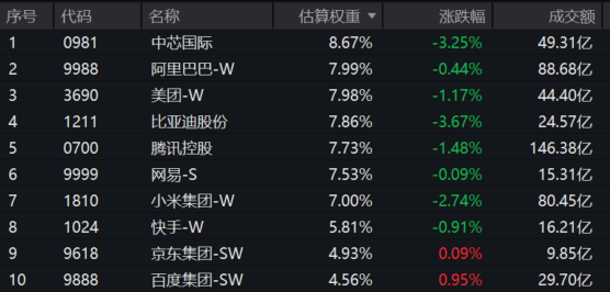 港股科技热门股多数收绿:中芯国际、比亚迪股份跌超3%,美团-W、腾讯控股跌超1%,阿里巴巴-W、网易-S微跌。