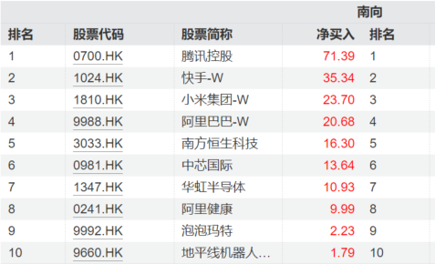 南向资金持续流入港股。近七日以来,腾讯控股以71.39亿港元的净买入位居榜首,快手-W、小米集团-W、阿里巴巴-W、中芯国际、华虹半导体、阿里健康、地平线机器人-W也均位于净买入榜前十。