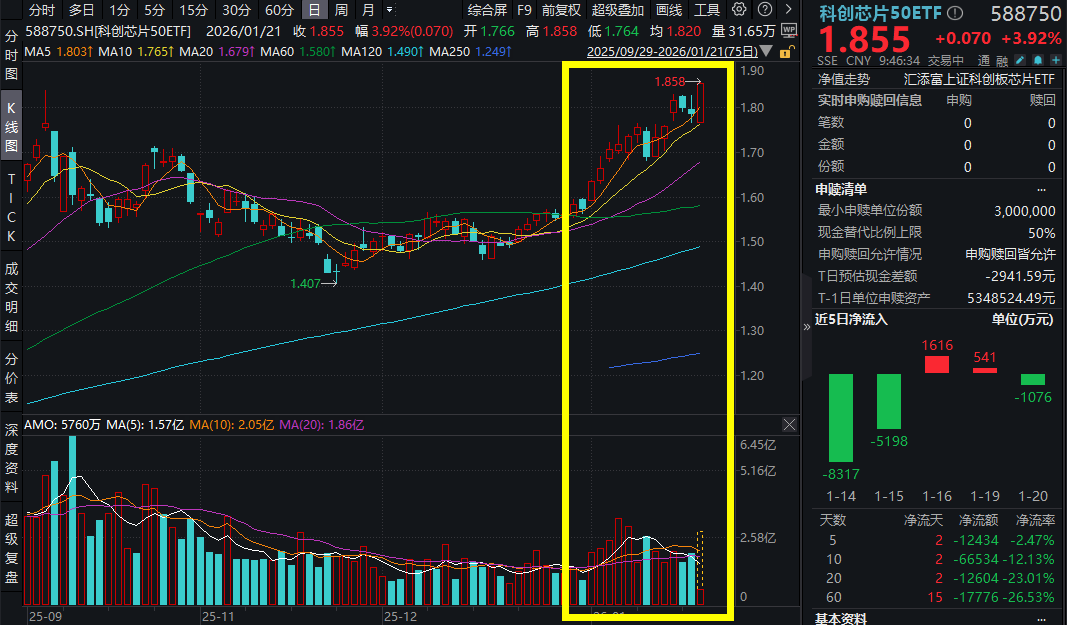 1月21日,A股市场震荡回调,受海外存储芯片股提振,科创芯片板块早盘强劲冲高!截至9:46,科创芯片50ETF(588750)直线拉升,暴涨近4%,盘中价创上市以来新高!