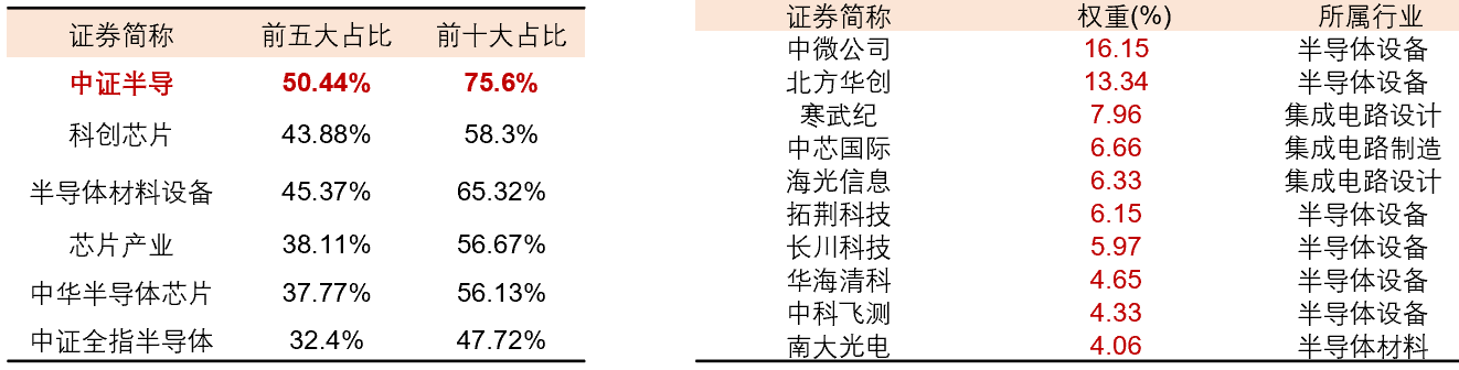 半导体设备ETF(561980)跟踪中证半导,标的指数中“半导体设备 材料 AI芯片设计”三行业占比超90%,重点覆盖中微公司(刻蚀设备)、北方华创(多领域设备)、中芯国际(制造龙头)、海光信息、寒武纪(AI芯片设计)、南大光电(半导体材料)等核心国产替代领域龙头,前五大集中度、前十大集中度在同类可比半导体指数中均位居第一。