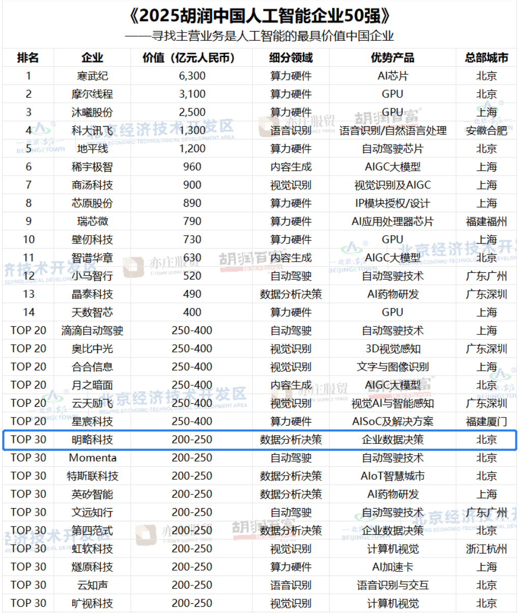 《2025胡润中国人工智能企业50强》部分榜单展示