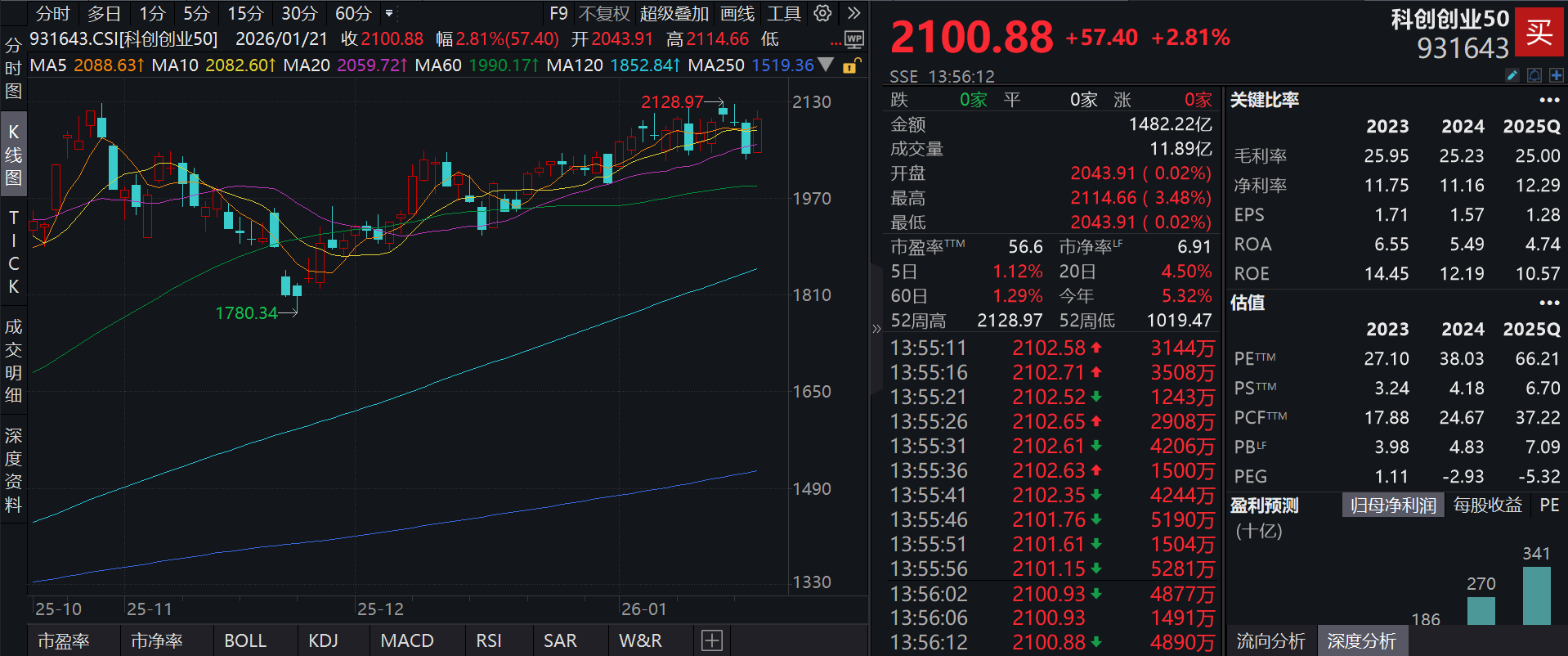 截至2026年1月21日 13:56,科创创业50指数(931643)强势上涨2.81%,成分股龙芯中科(688047)上涨20.00%,海光信息(688041)上涨13.30%,澜起科技(688008)上涨12.01%,三环集团(300408),圣邦股份(300661)等个股跟涨。