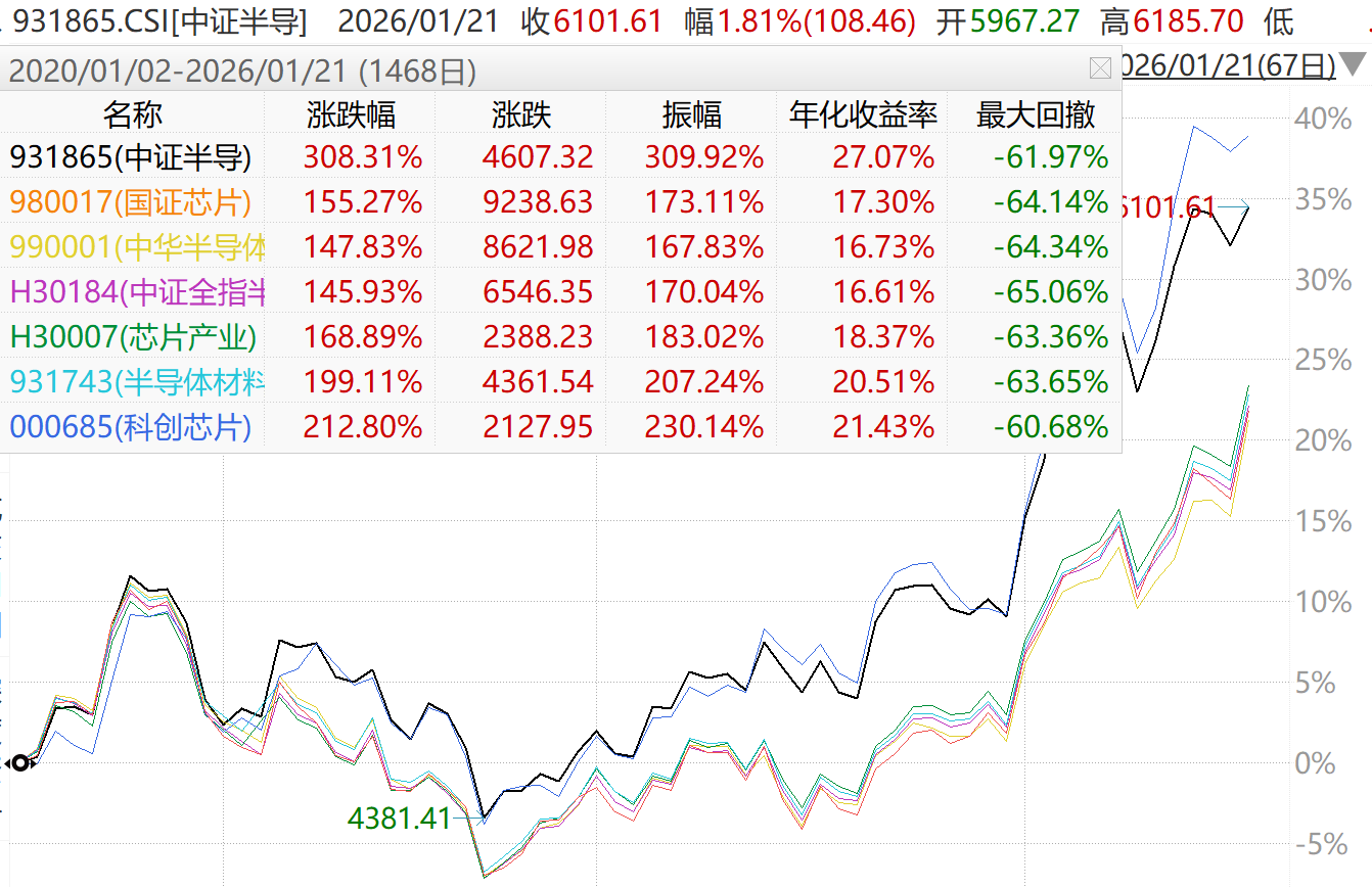 这个ETF跟踪的中证半导,目前是主流半导体指数中趋势最强的——2020年至今跑赢科创芯片100% ,2025年以来直接实现涨幅翻倍,弹性吊打半导体材料和设备。
