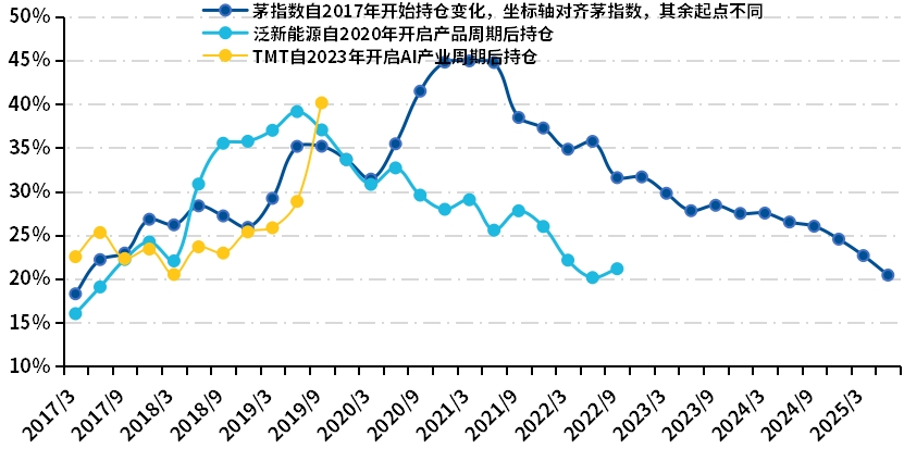 图:AI 与泛新能源、茅指数三轮机构持仓对比