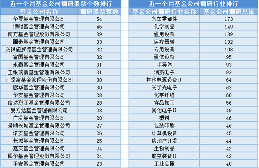 近一个月(12月22日-1月21日),华夏基金参与公司调研的数量最多,共调研54家上市公司,此外调研较为活跃的还有博时基金、南方基金和国泰基金,分别调研45家、39家、33家上市公司;从调研行业上来看,基金公司对汽车零部件行业的上市公司调研次数最多,共有173次,其次是化学制品行业,基金公司调研了149次。