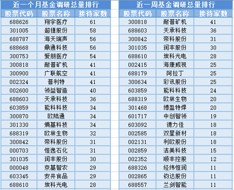 从个股调研情况上来看,最近1个月(12月22日-1月21日)最受公募基金关注的是翔宇医疗,翔宇医疗属于医疗器械行业,主营业务为康复器械领域的综合性产品制造和服务供应商,是一家致力于康复医疗器械研发、生产、销售和服务为一体的国家高新技术企业。共有61家基金管理公司参与调研,其次是超捷股份和海天瑞声,分别接受58家、56家基金管理公司的调研。