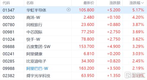大型科技股多数上涨,华虹半导体涨超5%,商汤涨超4%,同程旅行、中芯国际、快手、百度涨超3%。