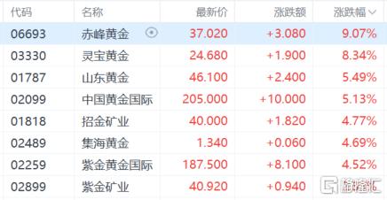 黄金股集体走强,赤峰黄金涨超9%,灵宝黄金涨超8%,山东黄金、中国黄金国际涨超5%,招金矿业、集海黄金等跟涨。