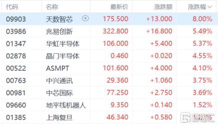 芯片概念股大涨,天数智芯涨超8%,兆易创新、华虹半导体涨超5%,晶门半导体、ASMPT涨超4%,中兴通讯、中芯国际等跟涨。