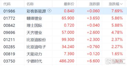 锂电池股概念表现活跃,赣锋锂业涨超5%,天齐锂业涨超4%,比亚迪股份、比亚迪电子涨超2%,天能动力、宁德时代等跟涨。