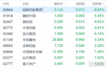 内房股走低,旭辉控股跌超8%,融创中国跌超5%,碧桂园、中梁控股、龙光集团跌超4%,华润置地、金辉控股等跟跌。