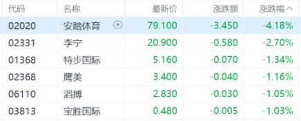 体育用品股跌幅明显,安踏体育跌超4%,李宁跌超2%,特步国际、滔搏等跟跌。