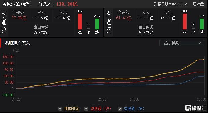 今日,南向资金净买入139.3亿港元,其中港股通(沪)净买入77.89亿港元,港股通(深)净买入61.41亿港元。
