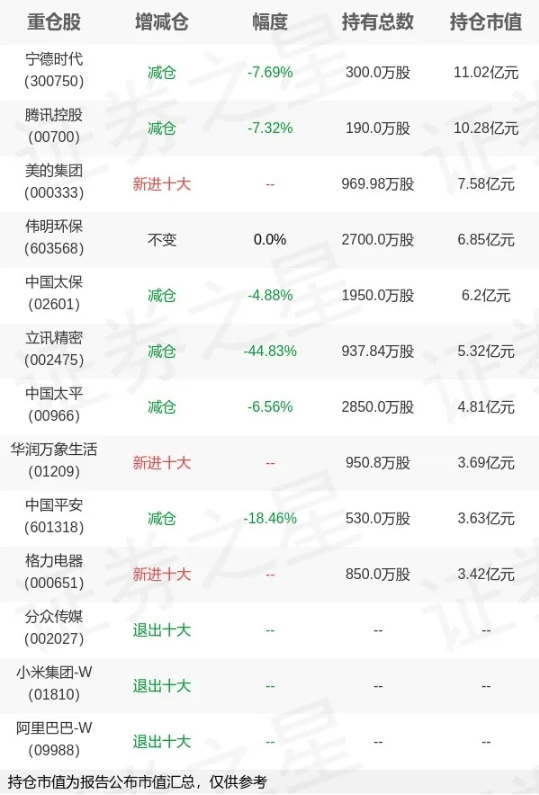 截至2025第四季度,赵枫整体持仓的前三大(按持仓市值排序)分别为:宁德时代、腾讯控股、美的集团。