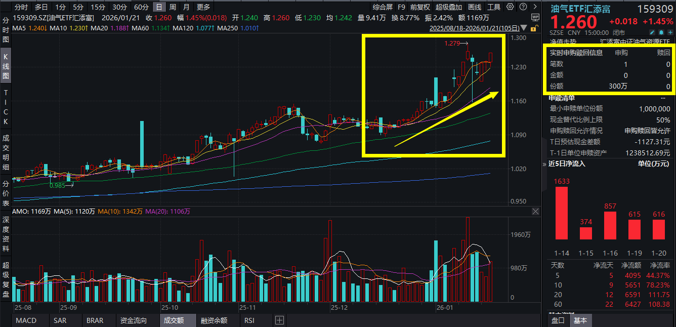 1月21日,A股震荡,沪指尾盘翘尾收涨。截至收盘,油气ETF汇添富(159309)再度上涨1.45%,喜提三连阳!资金持续涌入,油气ETF汇添富(159309)全天吸金400万元,加上今日已连续7日吸金超4900万元。