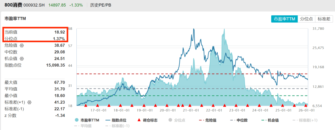 当前市场热点轮动加速,资金高低切换!聚焦大消费板块,其估值性价比仍极具吸引力。截至1月20日,消费ETF(159928)标的指数市盈率TTM为18.92倍,处于近10年1.37%分位点,比近10年历史上近99%的时间便宜,估值性价比更高!