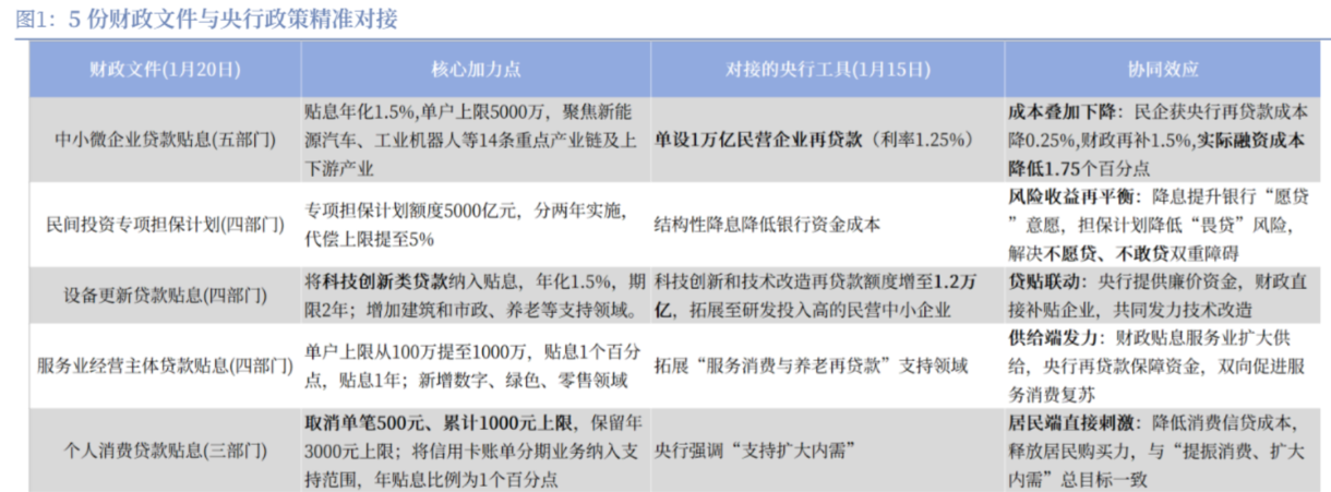 会议方面,1月15日,央行举行新闻发布会,推出八项结构性货币政策措施,并强调在实施过程中,将与财政贴息、担保和风险成本分担等财政政策协同配合。20日有关部门发布5份贴息、担保等政策文件,精准对接央行重点支持的扩大内需、科技创新、中小微企业等领域。