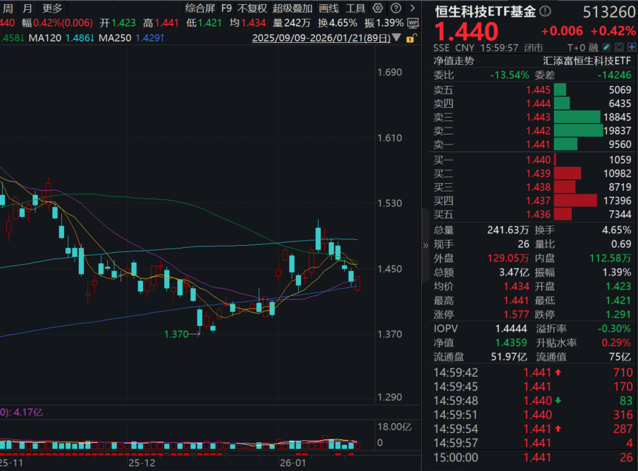 同类唯一15BP最低档管理费的恒生科技ETF基金(513260)收涨0.42%,终结四连阴,全天成交额超3.4亿元!资金面上,全天持续溢价,近5日累计“吸金”超8700万元!基金最新融资余额超1.5亿元,最新规模超74亿元!