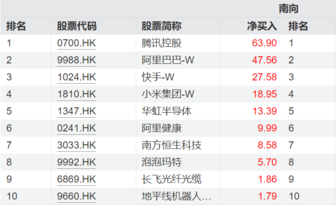 南向资金持续流入港股。近七日以来,腾讯控股以63.9亿港元的净买入位居榜首,阿里巴巴-W、快手-W、小米集团-W、华虹半导体、阿里健康、地平线机器人-W也均位于净买入榜前十。