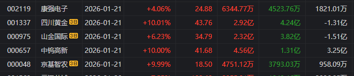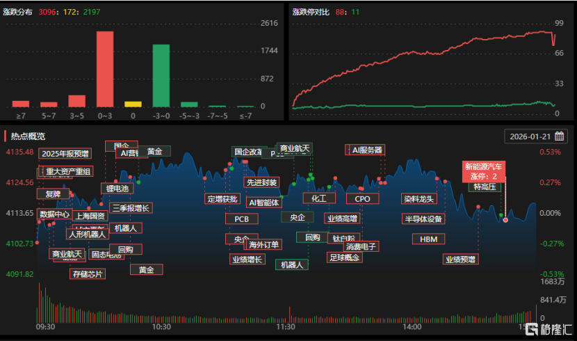 1月21日,沪指涨0.08%,深证成指涨0.7%,创业板指涨0.54%。全市场成交额2.61万亿元,近3100股上涨。黄金、天然气、半导体、CPO、PCB等板块涨幅居前。