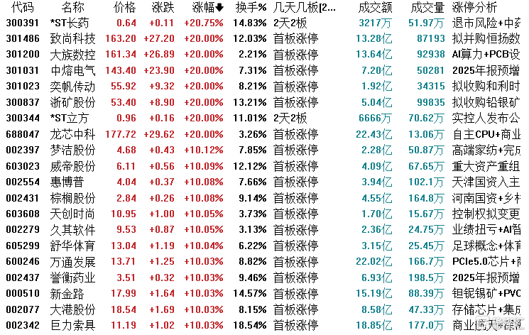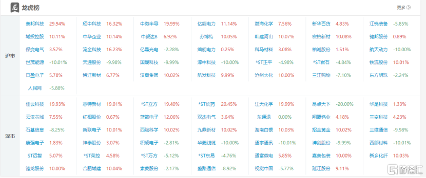 高位股方面,锋龙股份16连板,广电电气4连板,江化微3连板,通富微电、动力新科等4天2板,天地在线3天2板,京基智农、盈方微等2连板,中钨高新、龙芯中科等涨停。