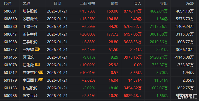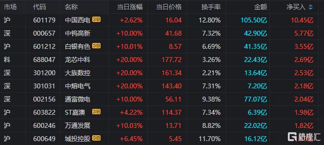 龙虎榜单日净买入额前三为中钨高新、龙芯中科、大族数控,分别为5.77亿元、2.69亿元、2.53亿元。