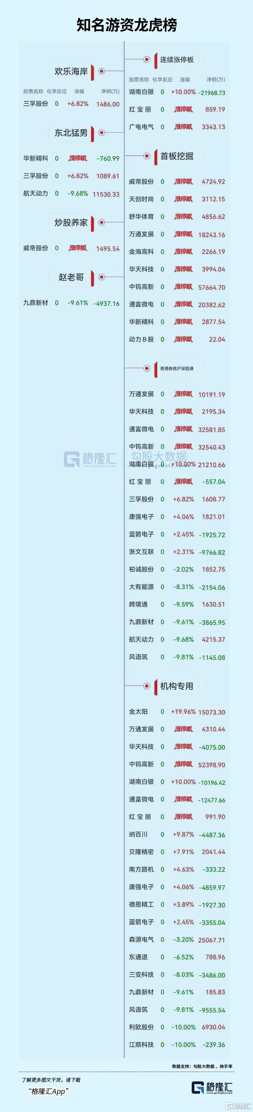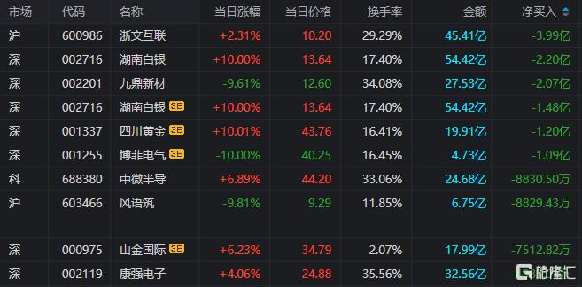 龙虎榜单日净卖出额前三为浙文互联、湖南白银、九鼎新材,分别为3.99亿元、2.20亿元、2.07亿元。