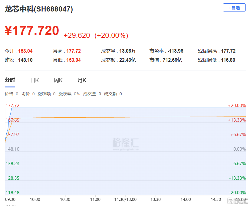 今日收报177.72元,涨跌幅20.00%,偏离值20.00%,换手率3.26%,成交额22.43亿。1机构净买入4369.62万元,沪股通专用席位净买入3115.37万元,成都系净买入1.19亿元。