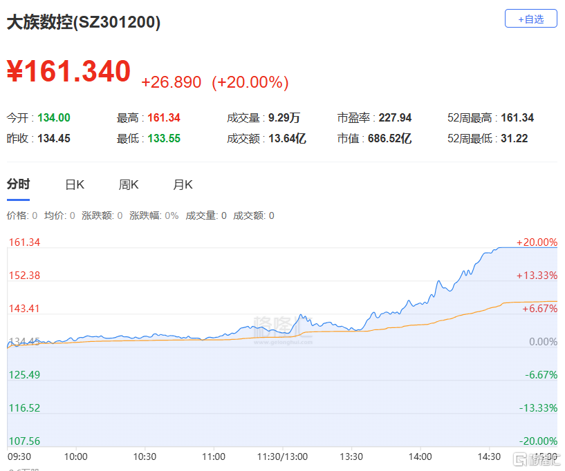 今日收报161.34元,涨跌幅20.00%,偏离值20.00%,换手率2.21%,成交额13.64亿。机构净买入2.79亿元,深股通专用席位净卖出1827.80万元,温州帮净卖出2210万元。