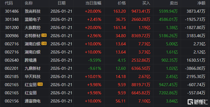 致尚科技:今日20cm涨停,偏离值20.00%,换手率12.03%,成交额13.28亿。龙虎榜数据显示,机构净买入6492.87万元,深股通专用席位净买入3873.47万元。