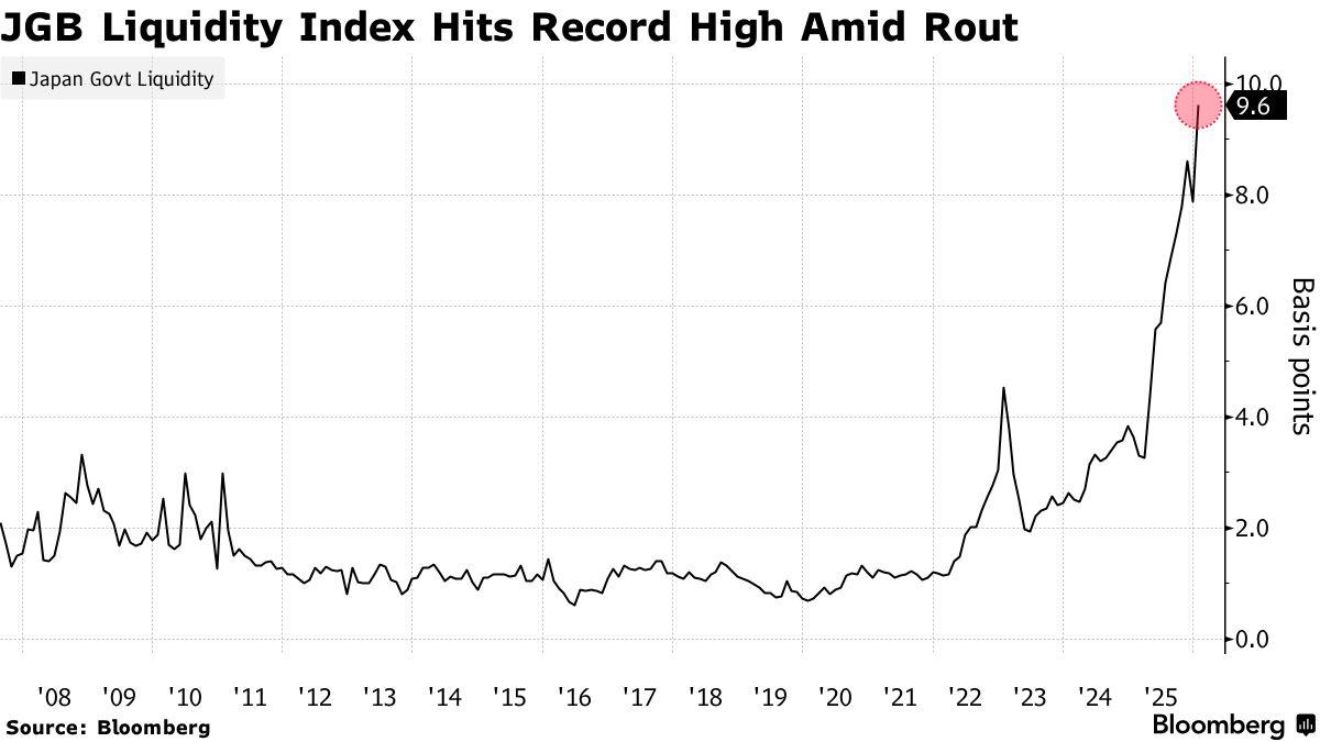 与此同时,20年期日债连续拍卖失败,表明债券需求骤降,市场流动性迅速下滑。彭博数据显示,日本国债流动性指数已飙升至历史新高,反映市场供需严重失衡。