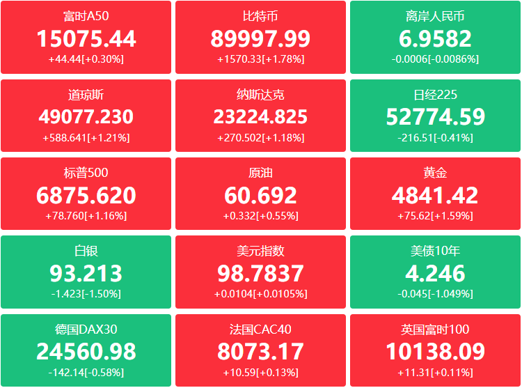 期货:现货黄金涨1.51%报4835.美元,黄金期货涨1.60%报4841.90美元;现货白银跌1.65%报93.0512美元;白银期货跌1.57%报93.150美元;铜期货跌0.10%报5.8065美元;现货铂金涨0.61%,现货钯金跌1.54%。原油期货收涨0.26美元,涨幅0.43%报60.62美元,布伦特原油涨0.32美元,涨幅超0.49%报65.24美元;天然气期货涨超过24.77%,报4.8750美元,最近两个交易日累计涨幅超过57.10%。汽油期货报1.8574美元,取暖油期货报2.4305美元。