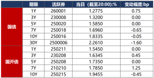 1月21日,由于税期资金面好于预期,债市整体偏强震荡。截至北京时间20:00,10年期国债活跃券250016收益率下行0.05bp至1.8335%,10年期国开债活跃券250215收益率下行0.45bp至1.9455%