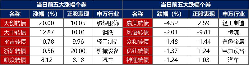 【转债市场主要指数集体跟涨】 1月21日,转债市场跟随权益市场有所反弹,中证转债、深证转债、上证转债分别收涨0.90%、0.89%、0.90%。转债市场成交额912.89亿元,较前一交易日放量29.46亿元。转债市场个券多数上涨,385支转债中,308支收涨,64支下跌,13支持平。当日上涨个券中,天创转债涨停20%,大中转债涨超12%,永吉转债、浙矿转债涨超10%;下跌个券中,嘉美转债跌逾4%,风语转债跌逾2%。