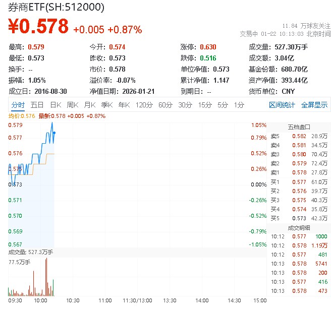 1月22日,券商板块表现活跃,截至发稿,财通证券涨超3%,国泰海通、太平洋、东方证券涨逾1%,顶流券商ETF512000场内价格一度涨逾1%,现涨0.87%,实时成交额超3亿元。