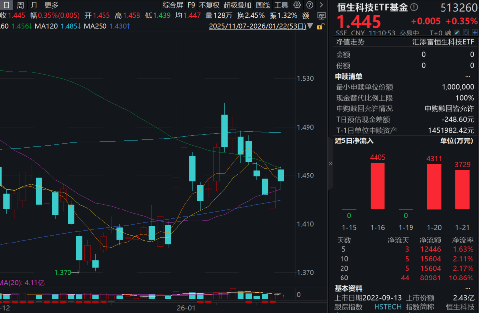 今日(1.22),受美股大涨催化,港股科技再度飘红,100%纯度的港股通科技30ETF(520980)冲高回落涨0.44%,成交额已超4.35亿元!盘中持续溢价高企,或反映资金积极加仓意愿!资金面上,昨日大举净流入超1.5亿元,近5日累计“吸金”超2.2亿元!
