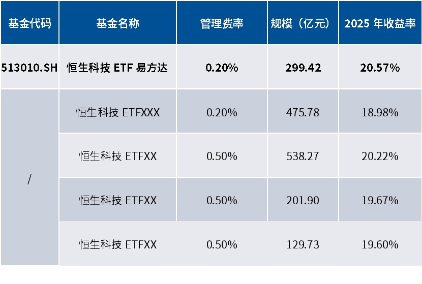 在指数配置层面,恒生科技 ETF 易方达(513010)提供了高效参与恒生科技指数配置的工具选择。该产品管理费率为 0.20%,显著低于部分同类 ETF 0.50% 的费率水平;业绩表现方面,2025 年其收益率较同类产品领先约 40–160 个基点,体现出较好的指数跟踪能力与运作效率。截至 2026 年 1 月 14 日,产品规模近 300 亿元,具备较好的流动性基础。综合考虑指数所处阶段、产品成本结构及跟踪表现,恒生科技 ETF 易方达(513010)是把握恒生科技指数中长期配置机会的优选工具之一,适合在看好 AI 产业演进与港股科技估值修复背景下进行中长期配置。