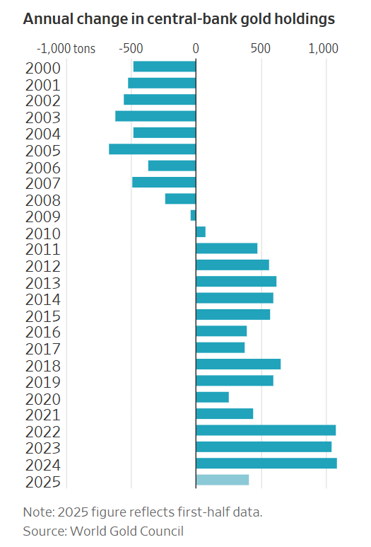 与此同时,普通投资者还需要与一类“不差钱”的黄金买家竞争——各国央行,对它们而言,金价高低通常并非考量因素。
